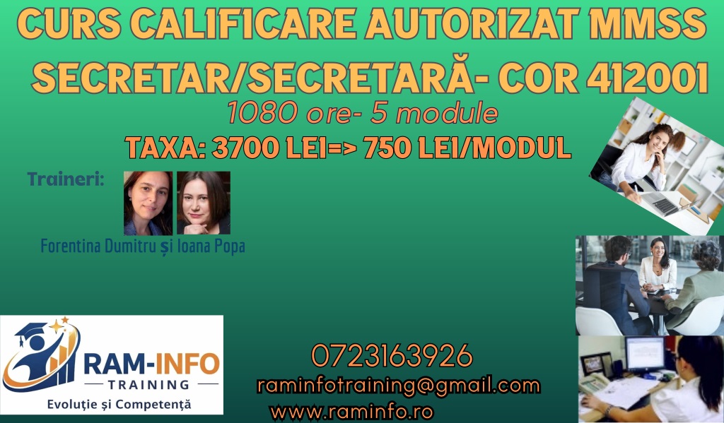 | Modul 1 SECRETARIAT ADMINISTRATIV | 180 60teorie+ 120 practică | Certificat absolvire-inițiere, elib.MMSS | 800 | 750 | 25 aprilie 2026 | medii | |