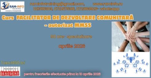 90 30teorie+60 practică | Certificat absolvire-specializare, elib.MMSS | 1500 | 1400 | 18 aprilie 2026 | medii | Facilitatorul susține membrii unei comunități să devină conștienți de ceea ce se întâmplă în jurul lor, să capete încredere în ei, să lucreze împreună și să rezolve nevoi comune….aici |