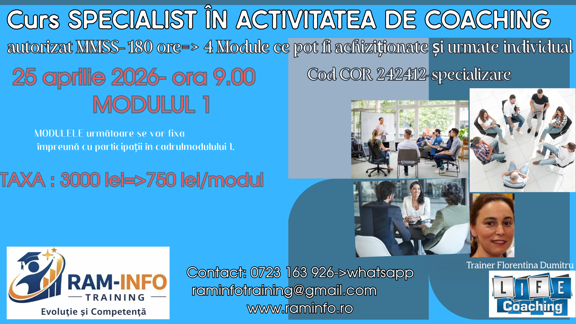 | Modul 1 Fundamentele procesului de coaching | 40 15 teorie+ 25 practică | Certificat absolvire-siglă proprie, elib.Ram-Info | 750 | 700 | 28 martie 2026 | superioare | |