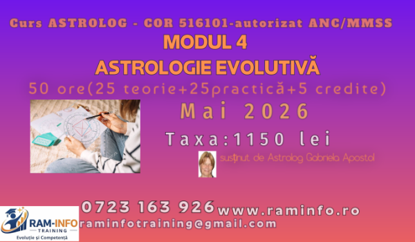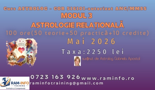 | Modul2 ASTROLOGIE RELAȚIONALĂ | 100 50 teorie+ 50practică+ 10 credite | Certificat absolvire-siglă proprie, elib.Ram-Info | 2250 | 2100 | grupă în formare pt.luna iunie 2026 | medii | Studiaza, relația dintre două sau mai multe persoane și descrie modul în care astrologia poate fi folosită pt. a ințelege experiențele personale,lipsa de încredere în sine, și valorile false ale societatii….aici |