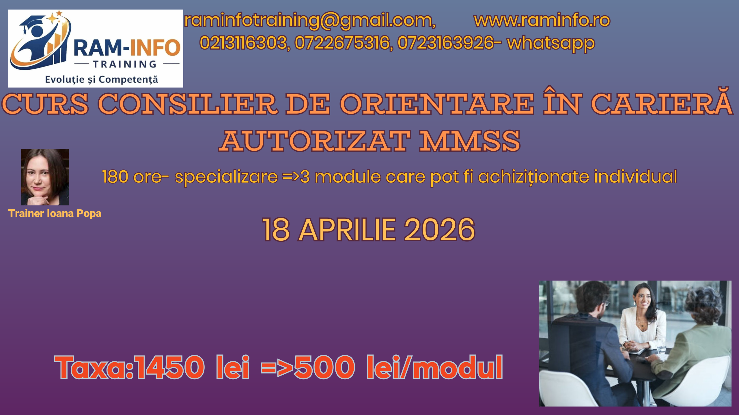 | Modul 2 Consiliere privind oportunitățile de carieră | 60 20teorie+ 40 practică | Certificat absolvire-siglă proprie, elib.Ram-Info | 500 | 450 | 19 aprilie 2026 | superioare | |