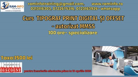 | Modul 2 Prestările tipografice. Realizarea tiparului lucrarii | 50 15 teorie+ 35 practică | Certificat de absolvire-siglă proprie, elib.Ram-Info | 850 | 800 | medii | ||