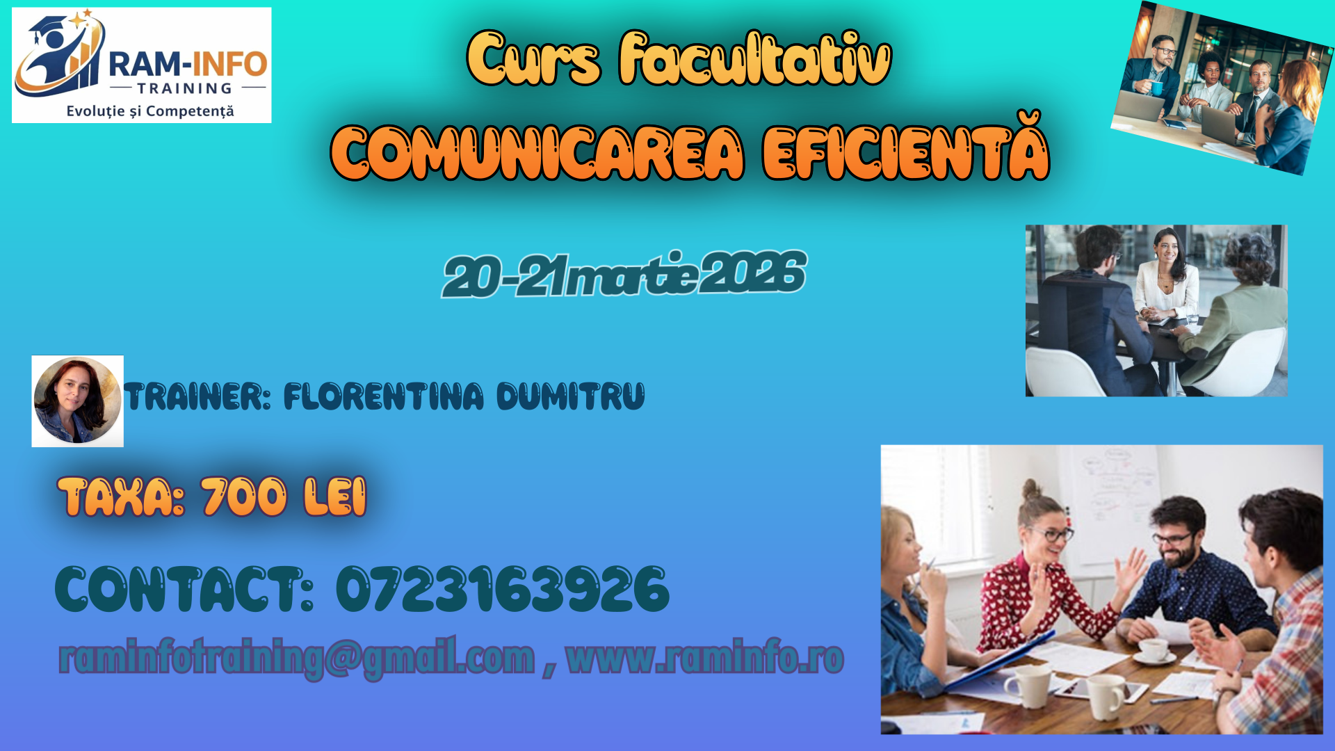 | 2. | Sâmbătă 18 APRILIE 2026–Ora 09.30 | Curs CONSILIER DE ORIENTARE ÎN CARIERĂ | 180 |