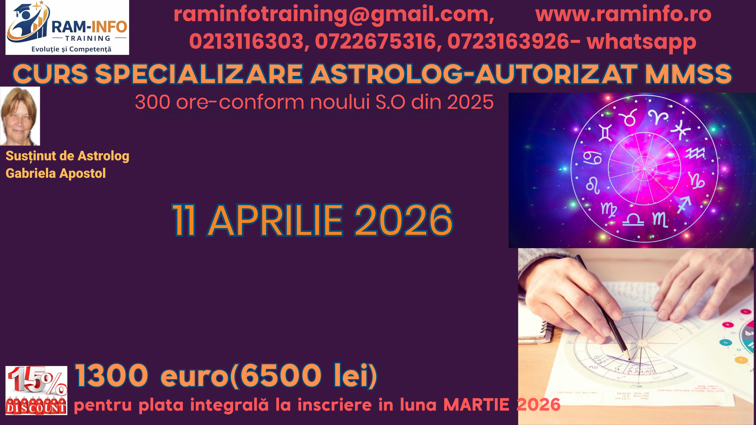 | 4. | 14 MARTIE 2026- ora 09.30 | Curs ASTROLOGIE EVOLUTIVĂ (15 ore teorie+15 ore practică) | 30 | facultativ/-