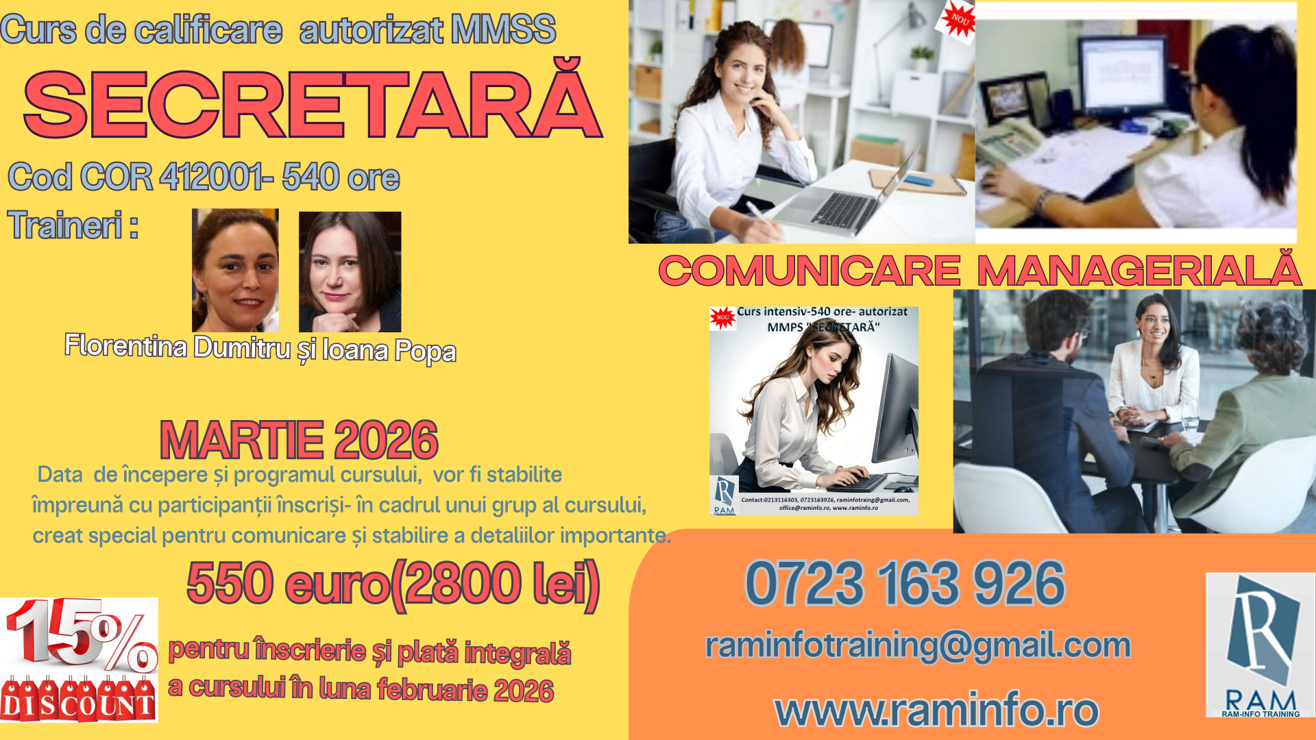 | 5. | 25 APRILIE 2026 -Ora 09.00 | CURS INTENSIV SECRETARĂ/5 module- COR 412001 | 540/5 module |